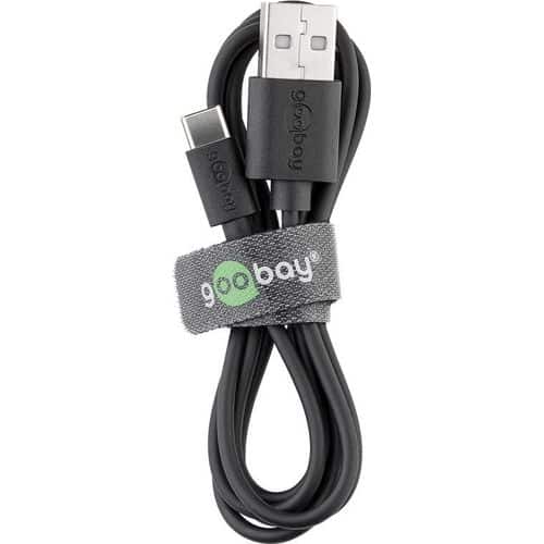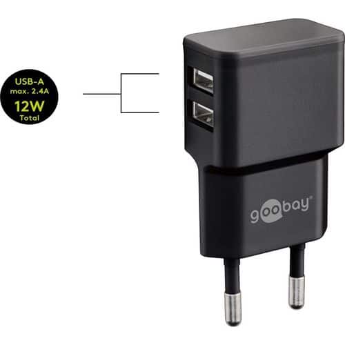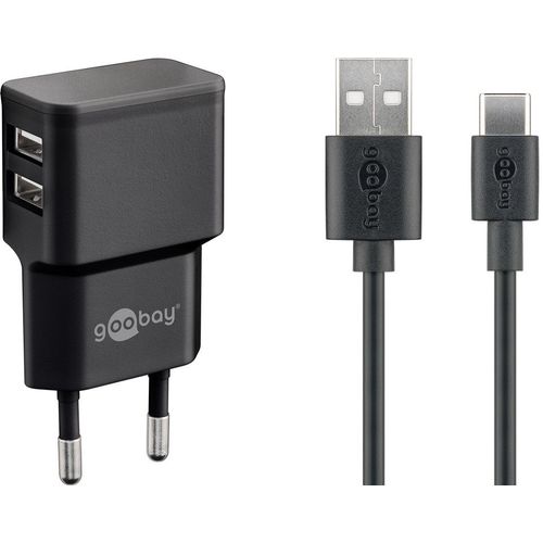Goobay Wandladeadapterset, 100-240V > 2x USB-A, 2.4A, 12W, 1 x USB A auf C Kabel 1m – schwarz