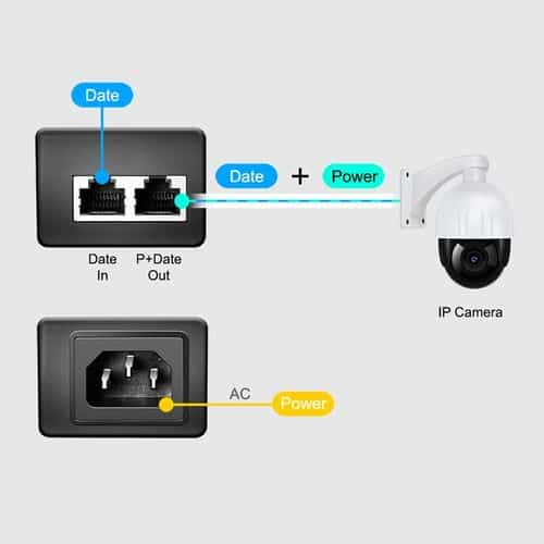 Interface: Ein Anschluss ( Data Port ) zum Anschluss an einen passiven Hub oder Switch und einen Stecker (Data & Power -Port) zum Anschluss an das PoE PD