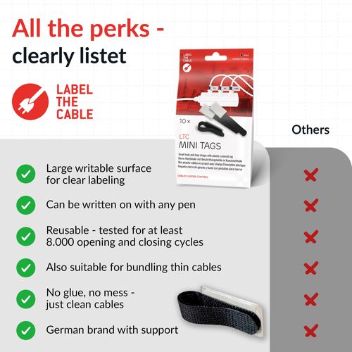 Die LABEL THE CABLE MINI TAGS revolutionieren die Art Kabel und Leitungen zu organisieren. Diese praktischen Kabeletiketten mit Klettverschluss (90mm x 12mm) und Beschriftungsfeld (30mm x 17mm) sorgen für sofortige Klarheit im Kabel-Chaos und verhindern lästige Verwechslungen bei Ladegeräten, Mehrfachsteckdosen und anderen Anschlüssen. Auch lassen sich LTC MINI TAGS kreativ zur Kennzeichnung aller anderen Dinge verwenden, wo Beschriftung das Leben vereinfacht.