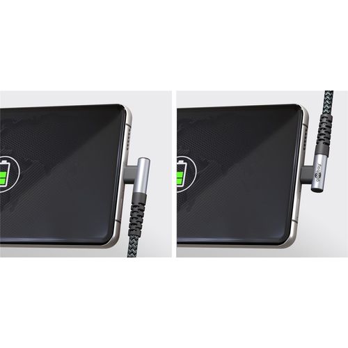 Der Stecker liegt durch den Winkel eng am Gerät an und vermeidet so effektiv Kabelbruch – besonders bei gleichzeitiger Nutzung und Aufladung des Gerätes